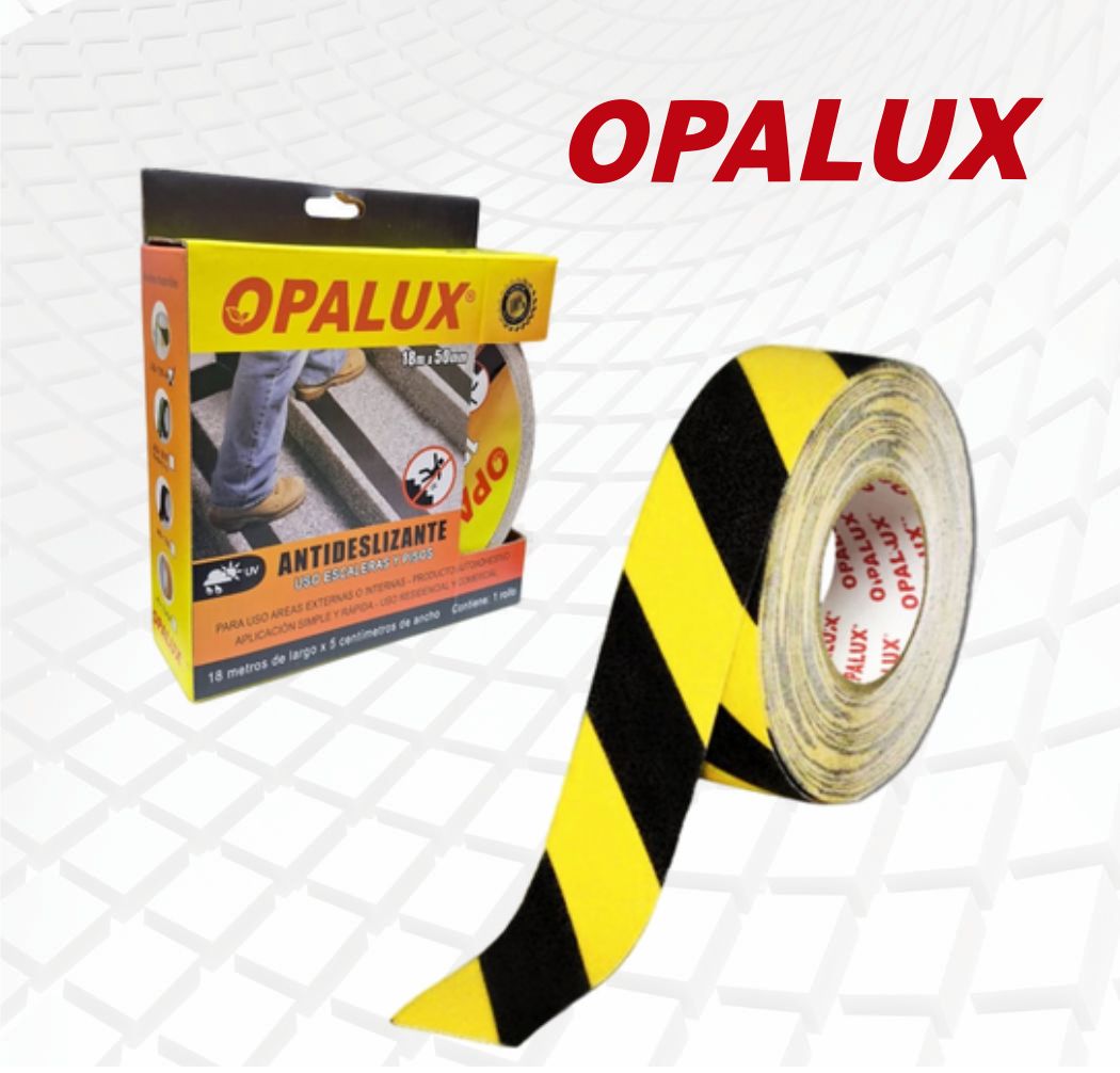 CINTA ANTIDESLIZANTE NEGRO/AMARILLO, AUTOADHESIVA, Rollo 5cm x 18mt. – OPALUX